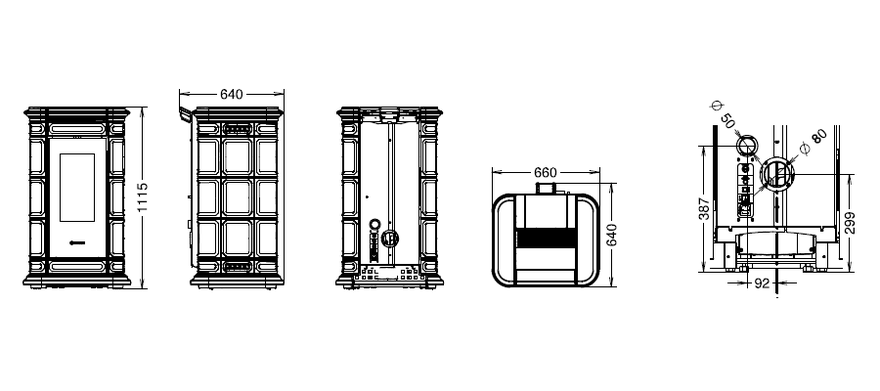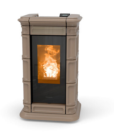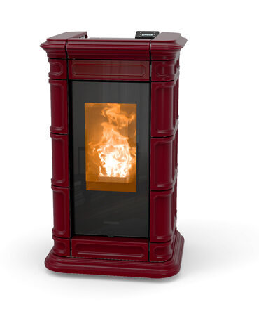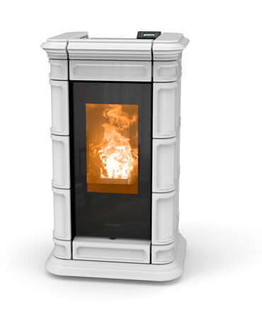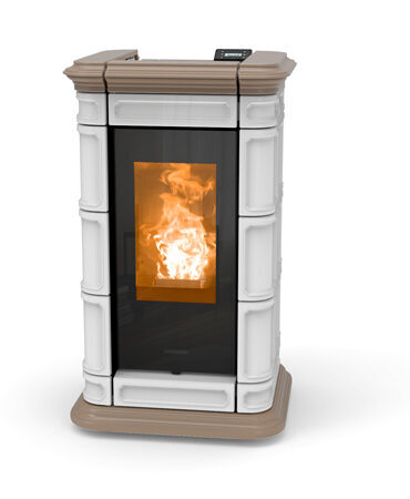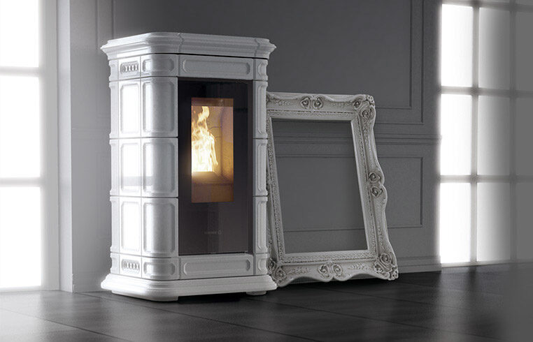 Pelletkachel Saint Moritz: stijl en elegantie verrijkt met kostbaar majolica, handgemaakt met fijn vakmanschap in reliëf. Verwarmbaar oppervlak ca.96 m².